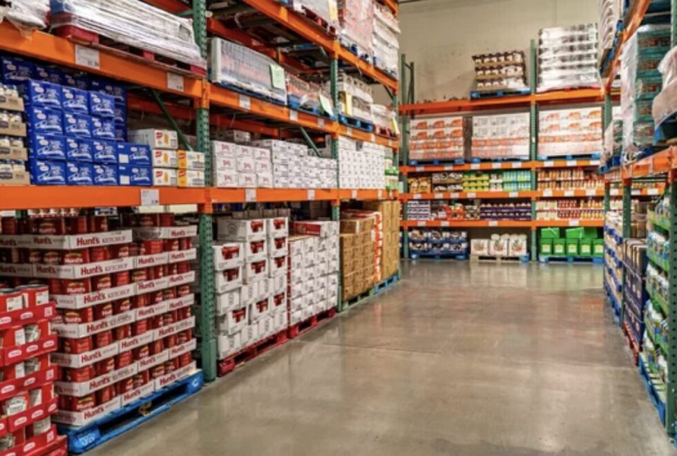 店内は天井が高く、広々とした通路に大型ラックがずらりと並び、商品はパレットのまま陳列されるスタイルです。商品のカテゴリーごとにゾーン分けされており、食品、日用品、家電、衣料品などが一望できる構造になっています。